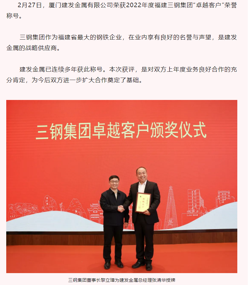 建發(fā)金屬獲評三鋼集團“卓越客戶”榮譽稱號